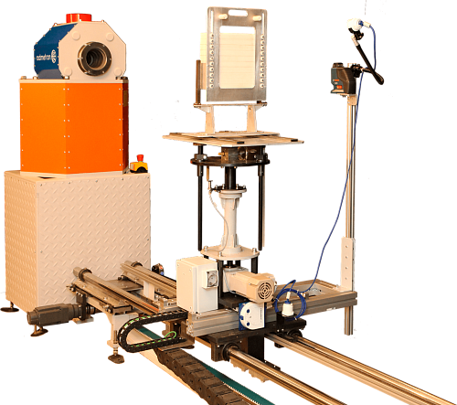 Система линейного перемещения рабочего стола с установленными на нем для проверки приборами имеет три оси перемещения рабочего стола (X, Y, Z) и осуществляет его вращение.