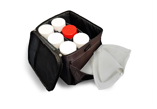 · Внутренне пространство поделено съемными разделителями на липучках на семь отделений, шесть из которых предназначены под баллоны и одно под ветошь. При необходимости можно поменять компоновку переставляя разделители, например, увеличив место для ветоши в основном отсеке